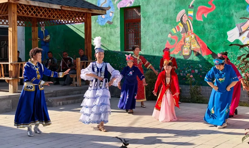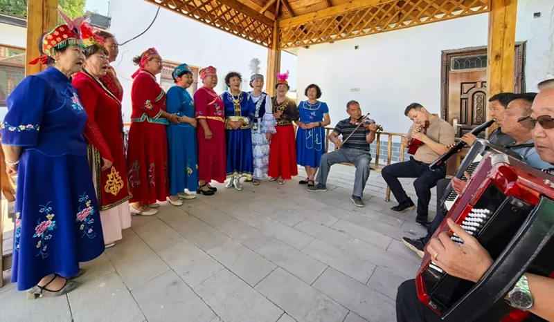 嵌入式居住不仅拉近了空间距离,更织密了情感纽带,乡里的“嘎山牡丹”乐队便是最好的证明。这支2022年由原中学教师韩新申组建的乐队,成员虽以锡伯族为主,却能熟练演奏维吾尔族的民歌、哈萨克族的乐曲,听着熟悉的歌谣,看着欢快的舞蹈,陌生感在欢声笑语中消散,归属感在彼此互动中增强。