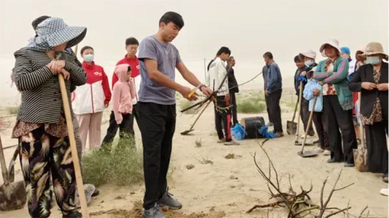 于田县创新探索出“政府引导、分片到户、就业增收、持续治沙”的妙方,巧妙的把防沙治沙事业与群众切身经济利益紧密挂钩,不断完善群众利益联结机制,吸引和支持群众全面参与产业治沙。在这场战天斗地的防沙治沙事业里,各民族群众牢固树立起“心连心、手牵手”的深厚情谊,就如同玫瑰花的根系一般,紧紧相连、相互扶持,在紧密合作中凝聚力量,于无私奉献里铸就担当,形成了休戚与共的利益共同体,共同构建起于田社会稳定和民族团结一家亲的坚固根基。