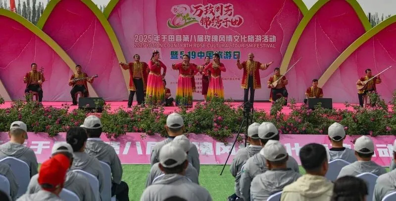 图为于田县第八届玫瑰风情文化旅游活动暨5·19中国旅游活动现场民间艺人进行歌舞表演。来源:石榴云/新疆日报