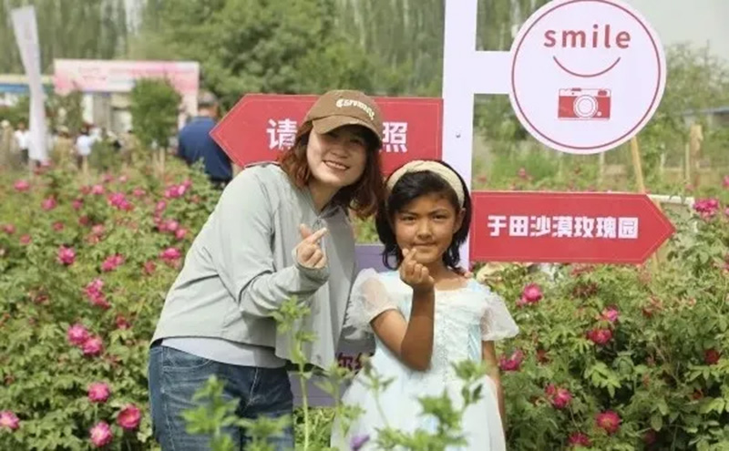 自玫瑰产业兴起以来,于田县以“沙漠玫瑰”为媒,将旅游、文化、产业、生态、康养深度融合,通过不断丰富玫瑰风情文化旅游节内涵,拓展出“玫瑰+文旅”“玫瑰+康养”“玫瑰+农业”等新业态,吸引着八方来客打卡体验。同时,玫瑰风情文化旅游节也是文化展示的窗口,让各族文艺爱好者同台演出,用舞蹈和歌声传递团结一心、共创美好生活的愿景。正如来自天津的游客李女士所说:“这里不仅有玫瑰花,更有诗和远方。”