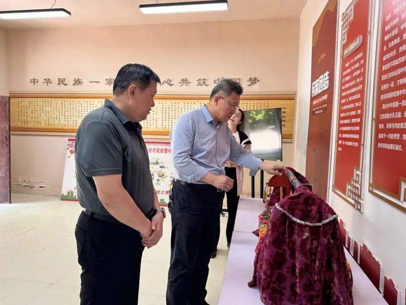 新疆社会科学院民族研究所党支部书记、所长,新疆民族研究学会副会长兼秘书长,中国科学院大学战略管理博士虎海峰(左二)听取九间楼乡小摇床故事