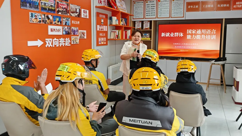 “怎么用国家通用语言文字更高效礼貌地表达‘麻烦拿一下外卖’‘向顾客解释延迟配送’?我们编个小品演一演就记住了!”在白碱滩区某外卖站点的培训课堂上,开放大学教师正带着骑手们用俚语小品解读国家通用语言文字知识点。20分钟的短课时、送教到站点的灵活模式,让骑手们在忙碌间隙就能快速“充电”。