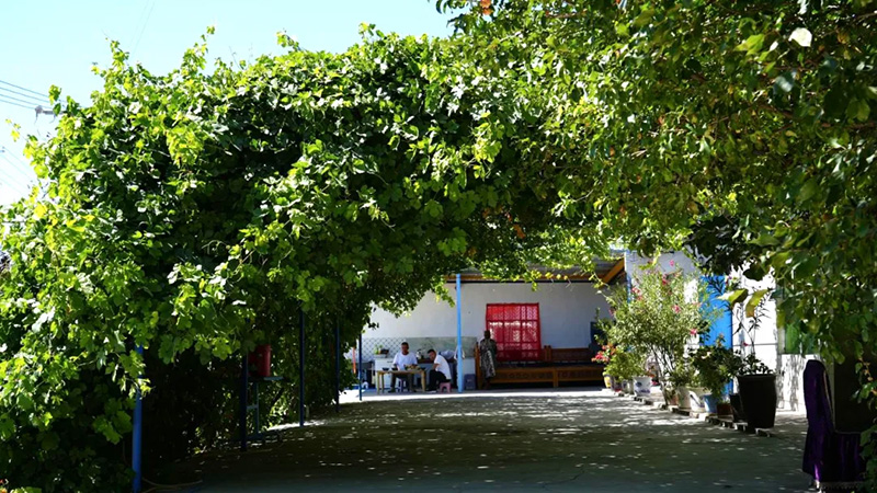 步入华侨村“葡聚园”,400米葡萄长廊蜿蜒曲折,团结亭、议事亭、桑梓亭等点缀其间,成为村民休憩和议事的公共空间。56岁的侨眷阿不力别克·克然木说:“我的父亲少年时归国,见证并参与了华侨村的建设发展,我们格外珍惜如今的幸福生活。”作为村中骨干,他主动参与村务,用实际行动搭建沟通之桥。