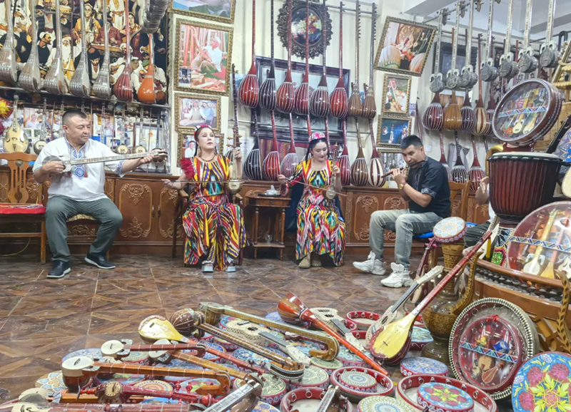 新疆喀什古城居民弹奏乐器。胡嘉琛 摄