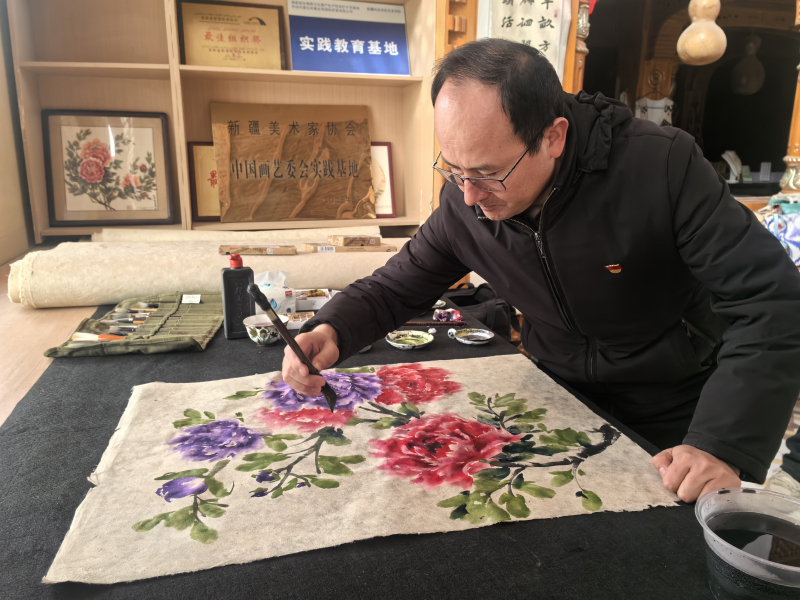 园区里,墨玉县美术协会副主席如则麦麦提·阿伍提,正伏案在桑皮纸上挥毫泼墨,毛笔起落间,水墨牡丹顺着纸的纤维纹理晕染开来,生出独特的古朴韵味。“很多艺术家因为‘桑皮纸上的中国画’项目认识了桑皮纸。”如则麦麦提说,各民族艺术家结伴深入和田乡村牧区采风,在桑皮纸上画胡杨、画沙漠,画新疆的风土人情,画各族人民对生活的热爱。一笔一画间,是文化的交融,更是心与心的贴近。