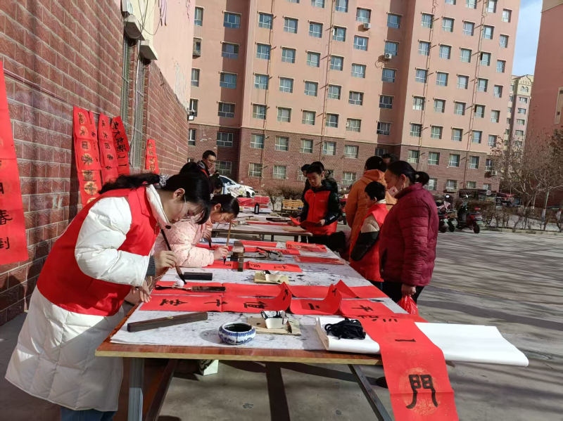 图为社区的小小书法爱好者正在为居民写春联。