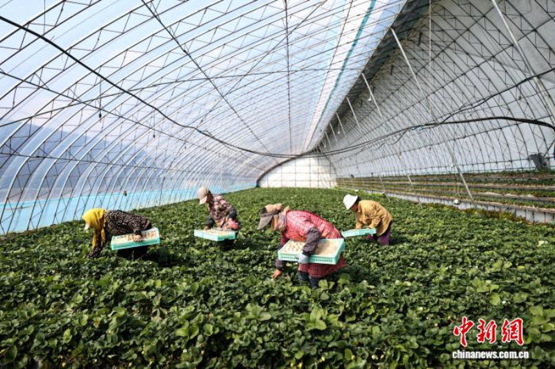 当天会上,多位与会代表提及农产品深加工和品牌培育。资料图为今年3月,辽宁省凤城市宝山镇岔路村一处种植“彩色草莓”的大棚内,工作人员在采摘草莓。中新社记者 于海洋 摄