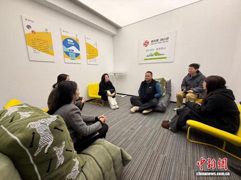 湖州安吉余村“青来集·同心荟”内,青年们相互交流。钱晨菲摄