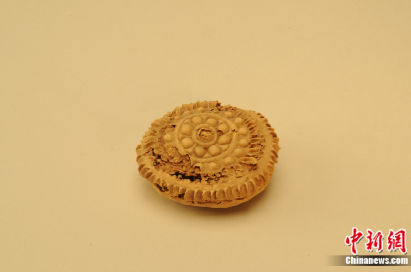 孙维国:1972年,新疆吐鲁番市阿斯塔那230号墓出土一块宝相花纹月饼,时代为唐代,吸引了不同领域的关注。这块月饼以小麦粉为原料,模压成型烘烤制成,呈圆形,土黄色,其上的宝相花纹清晰可见。它制作精致,花纹图案搭配错落有致。是唐代吐鲁番居民面点制作技艺的呈现,也是目前中国考古发现的唯一一件唐代月饼式食物实物。