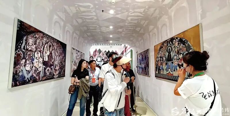 游客在克孜尔石窟景区龟兹壁画艺术馆内观看“缘起龟兹——龟兹石窟博物馆陈列展”。图/克孜尔石窟景区提供