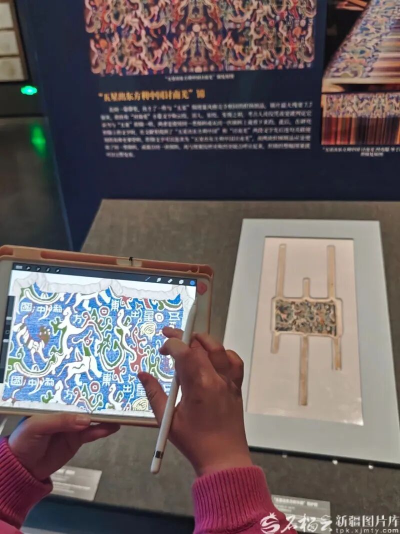 “我在新疆博物馆画文物”活动中,参与者临摹“五星出东方利中国”锦护臂。张蕾摄